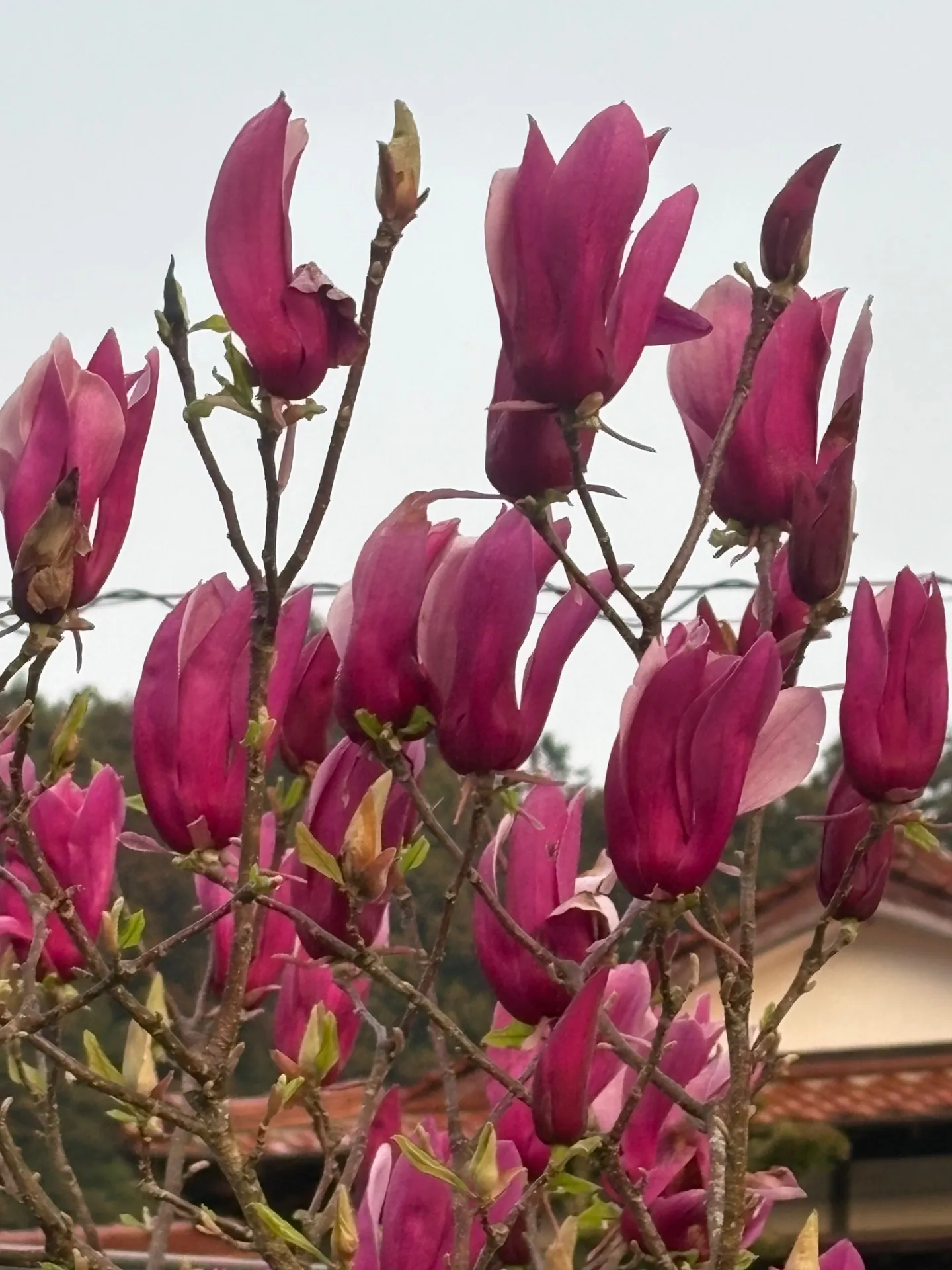 昼間の暖かさで満開になった木蓮も、朝だけは寒そうにしています。